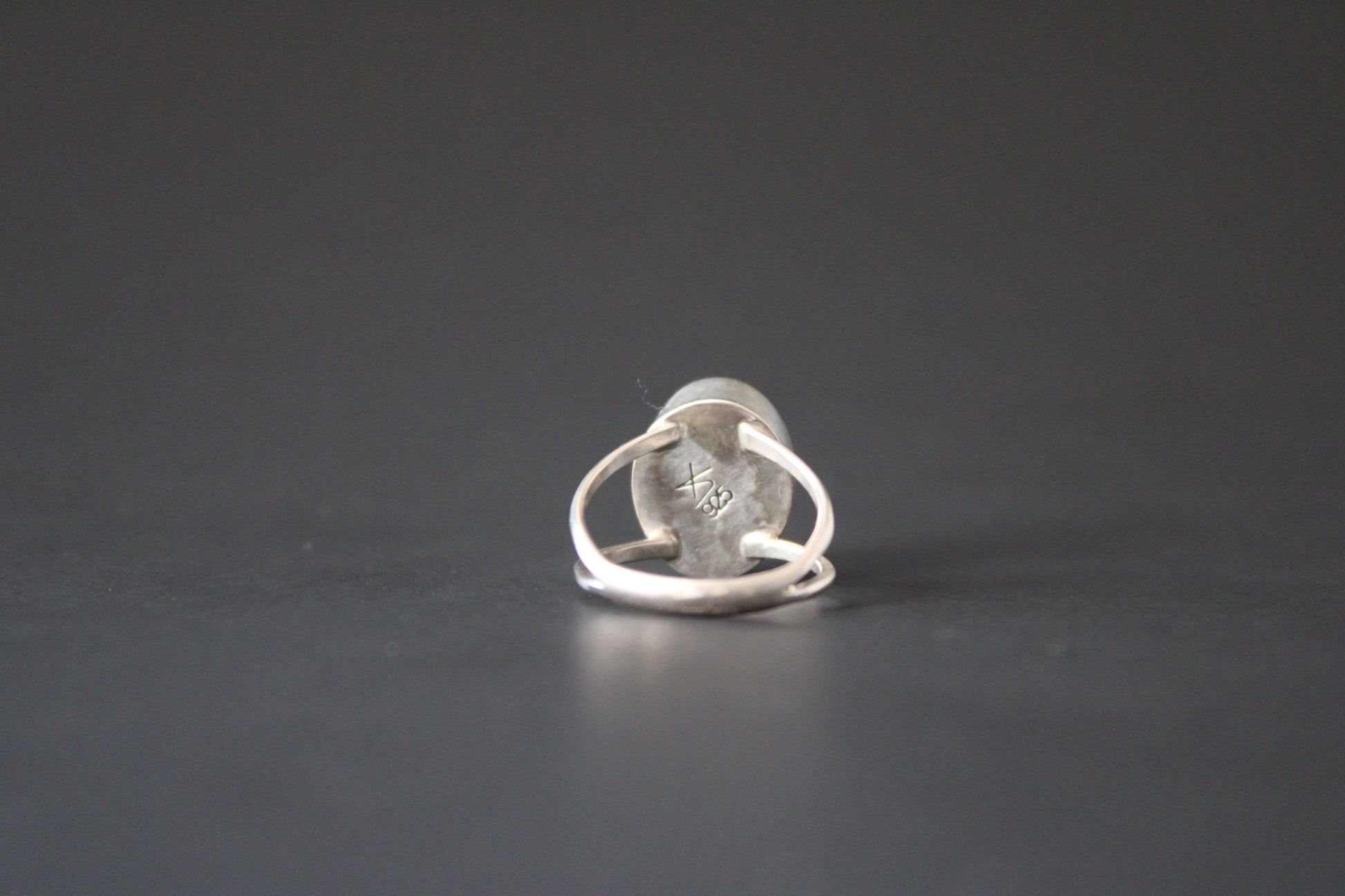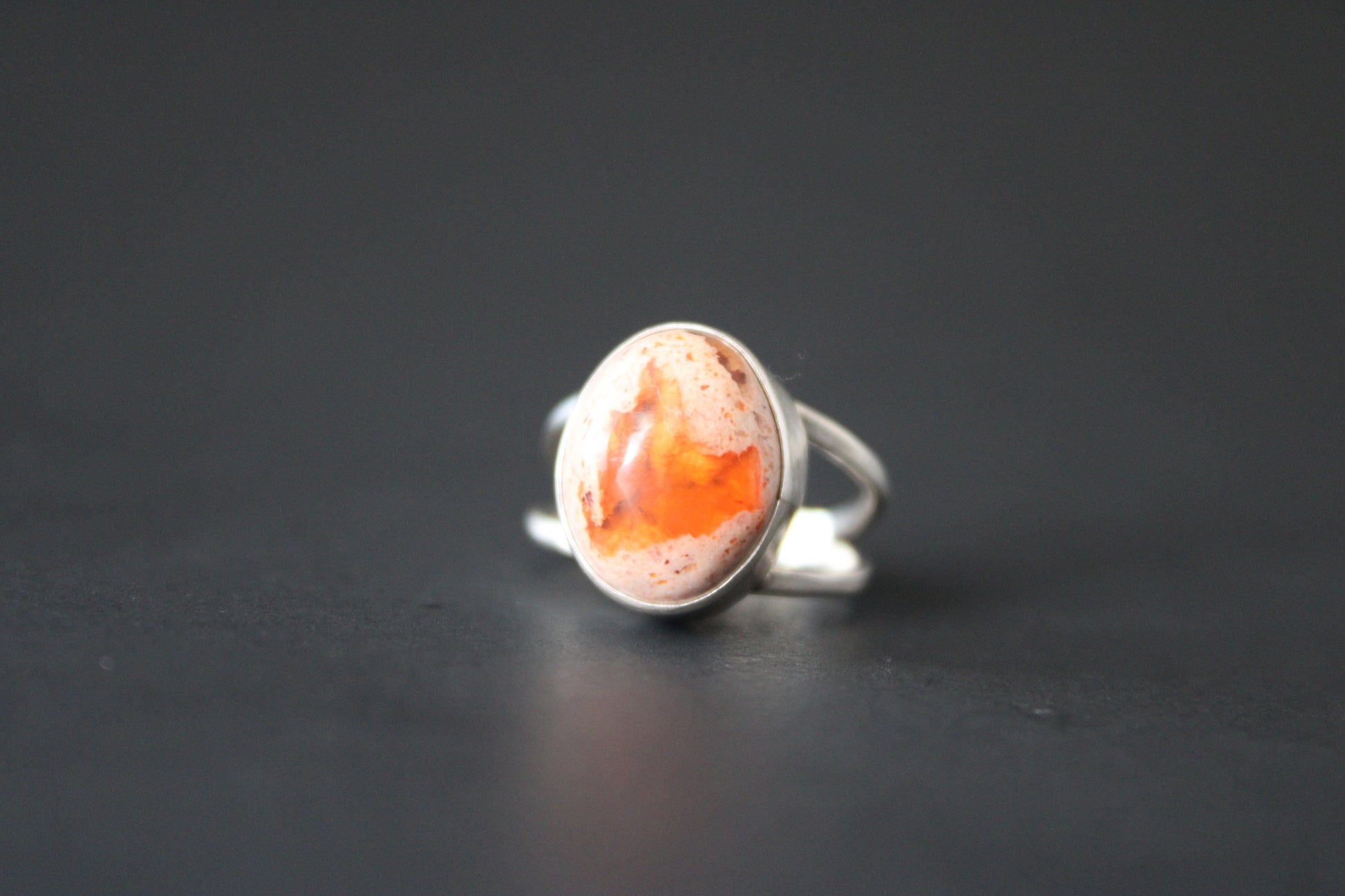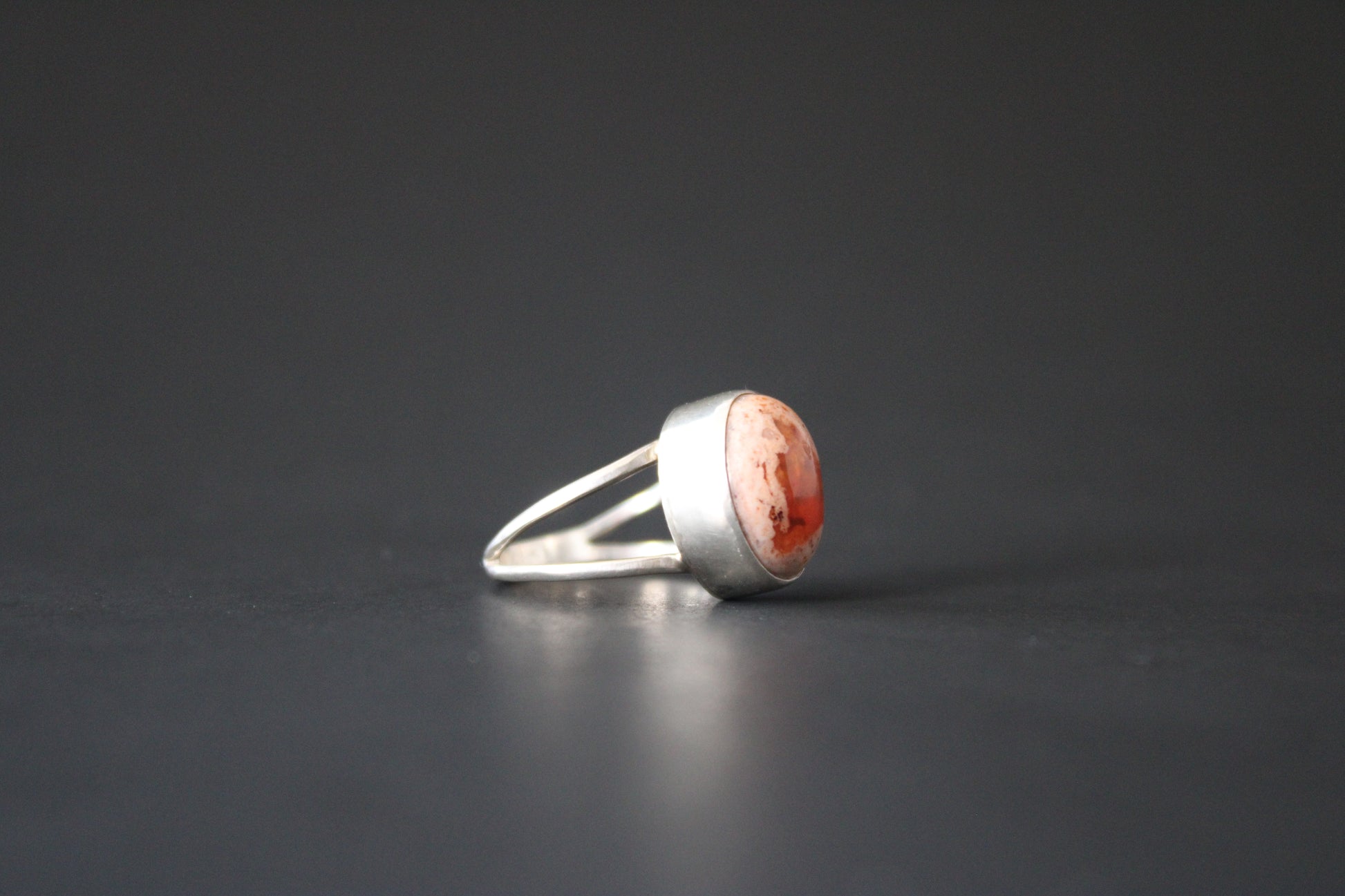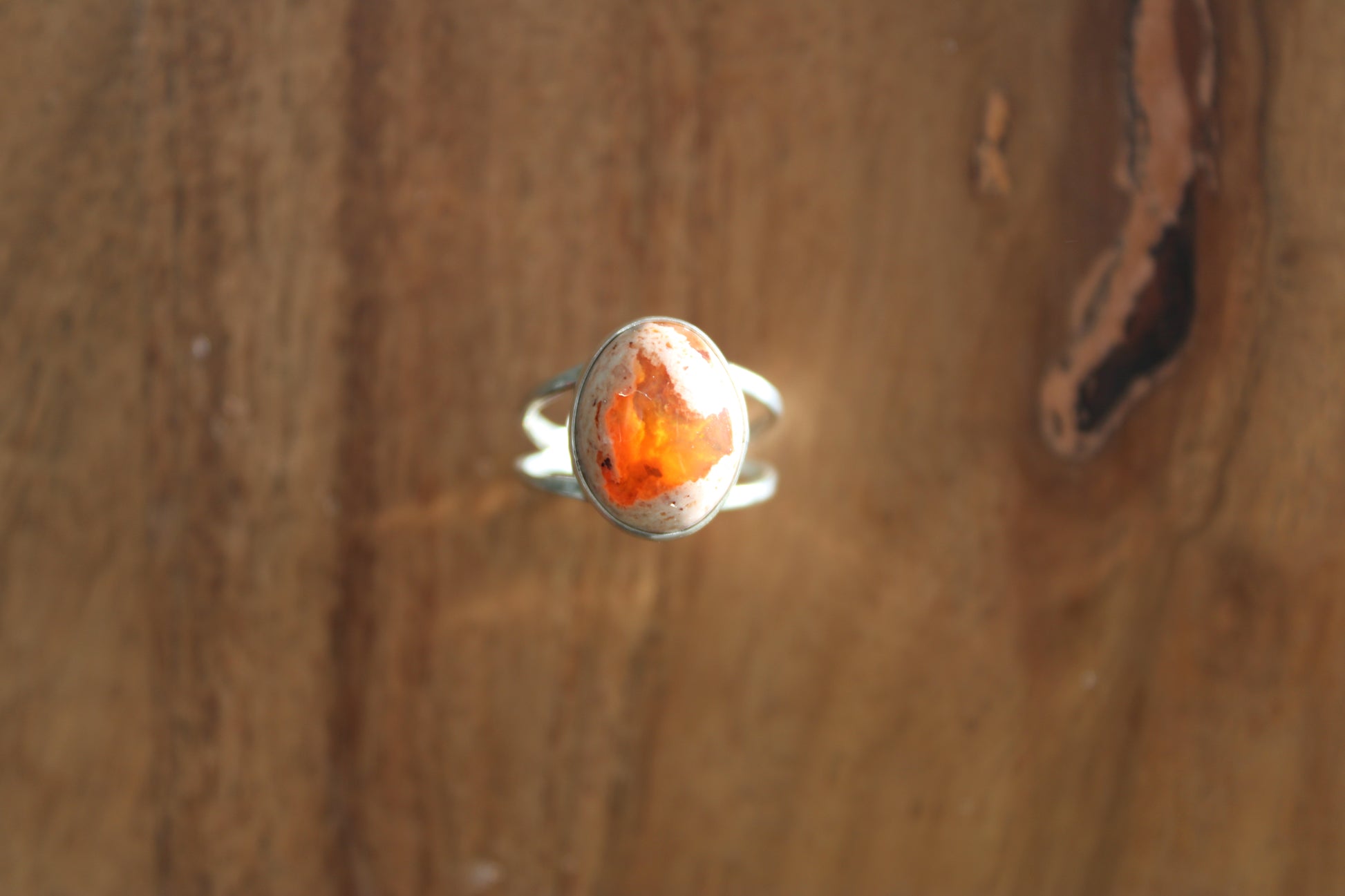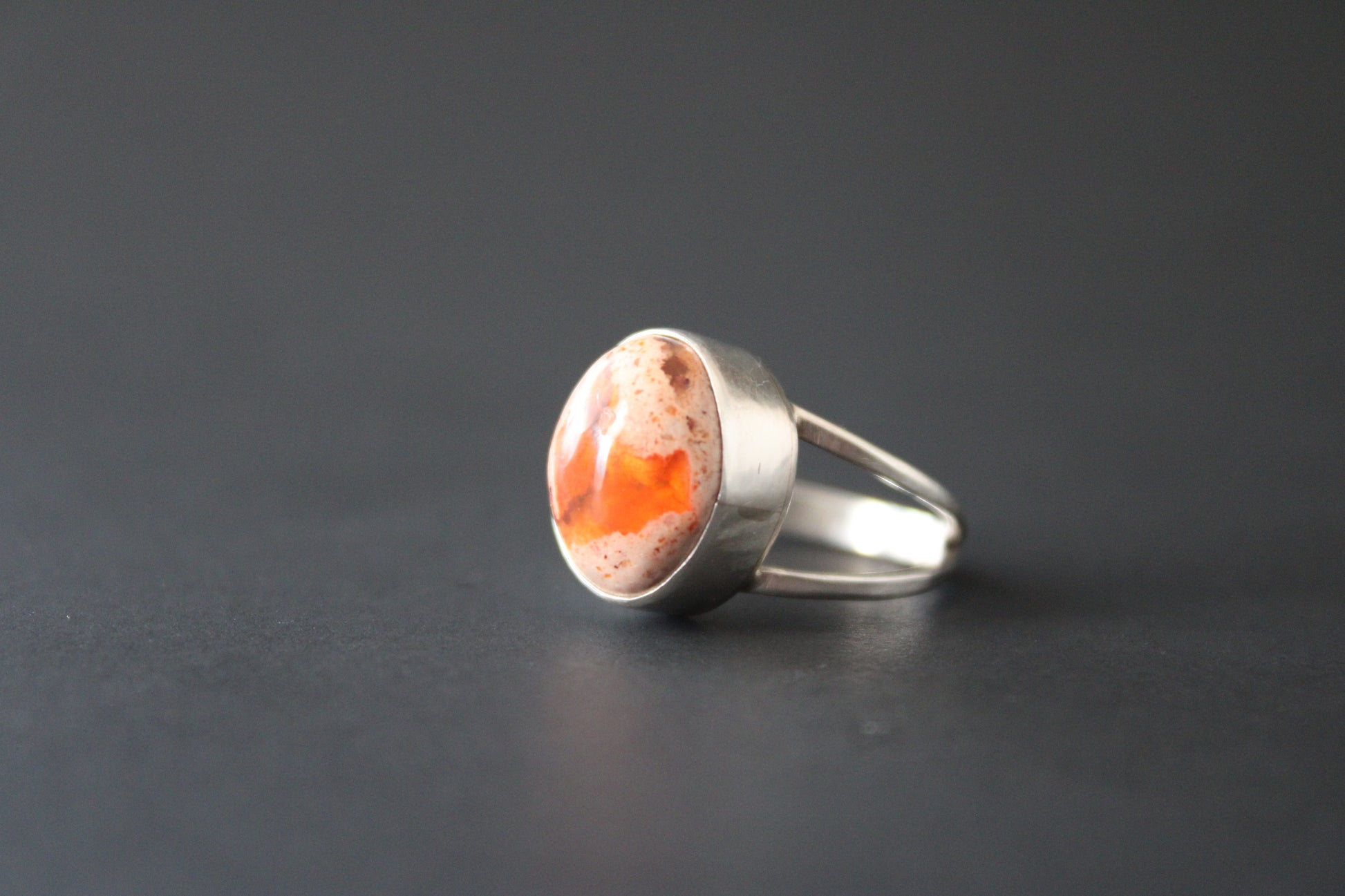 This bezel set fire opal has great color and is set in a 3/16" bezel which is mounted on a hand cut shank.