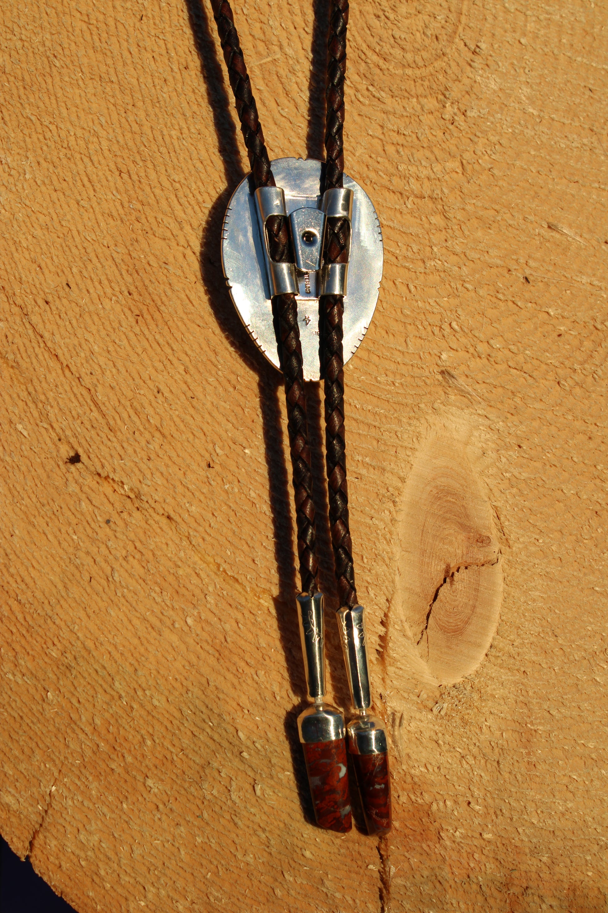 The slide on the back is also handmade from sterling silver to house the spring and button mechanism (nickel steel) for an adjustable fit for various neck sizes. The bolo cord is high quality black and brown leather (4mm) capped off with unique swiveling bolo tips cut from the same slab as the main piece.