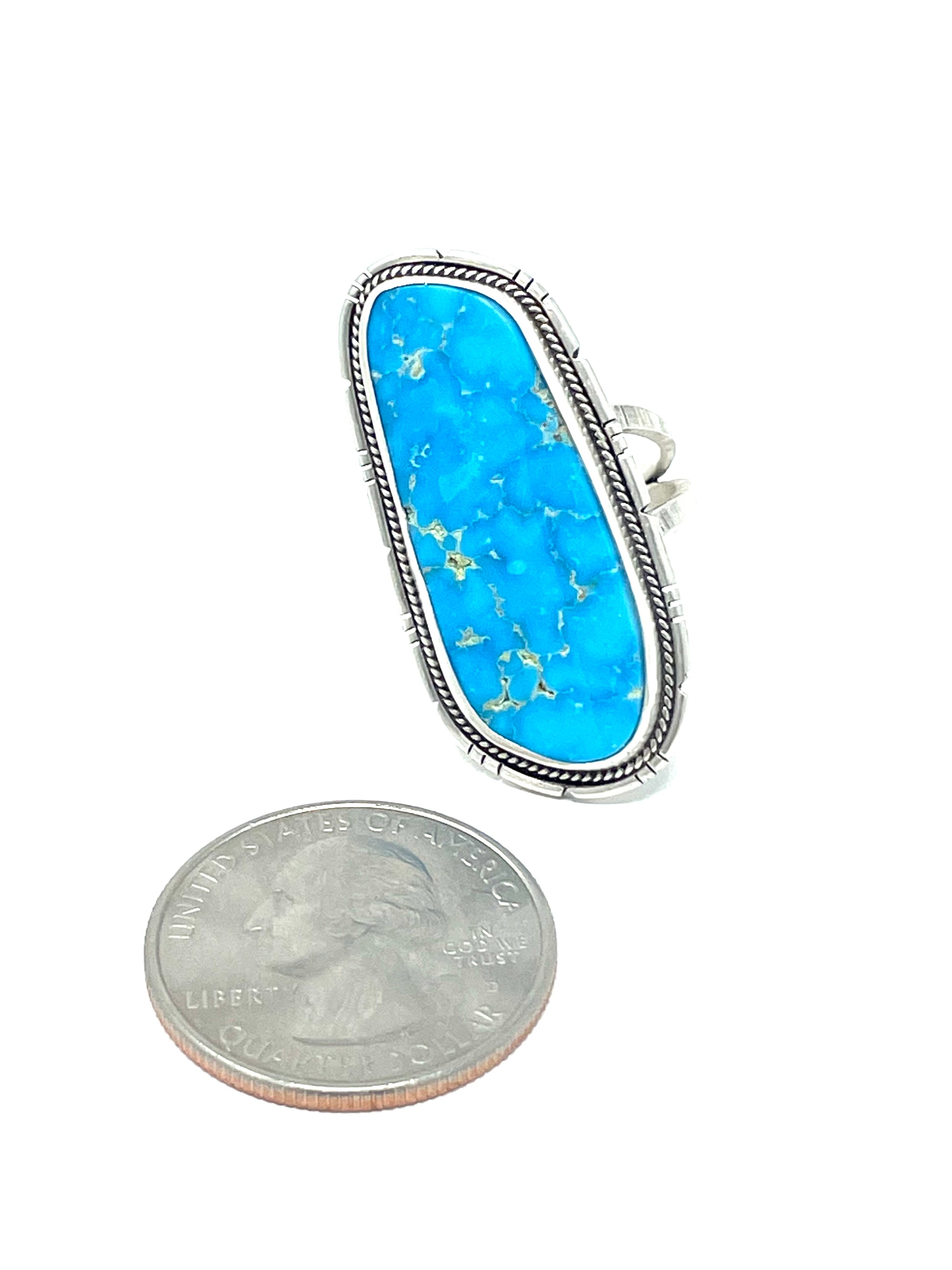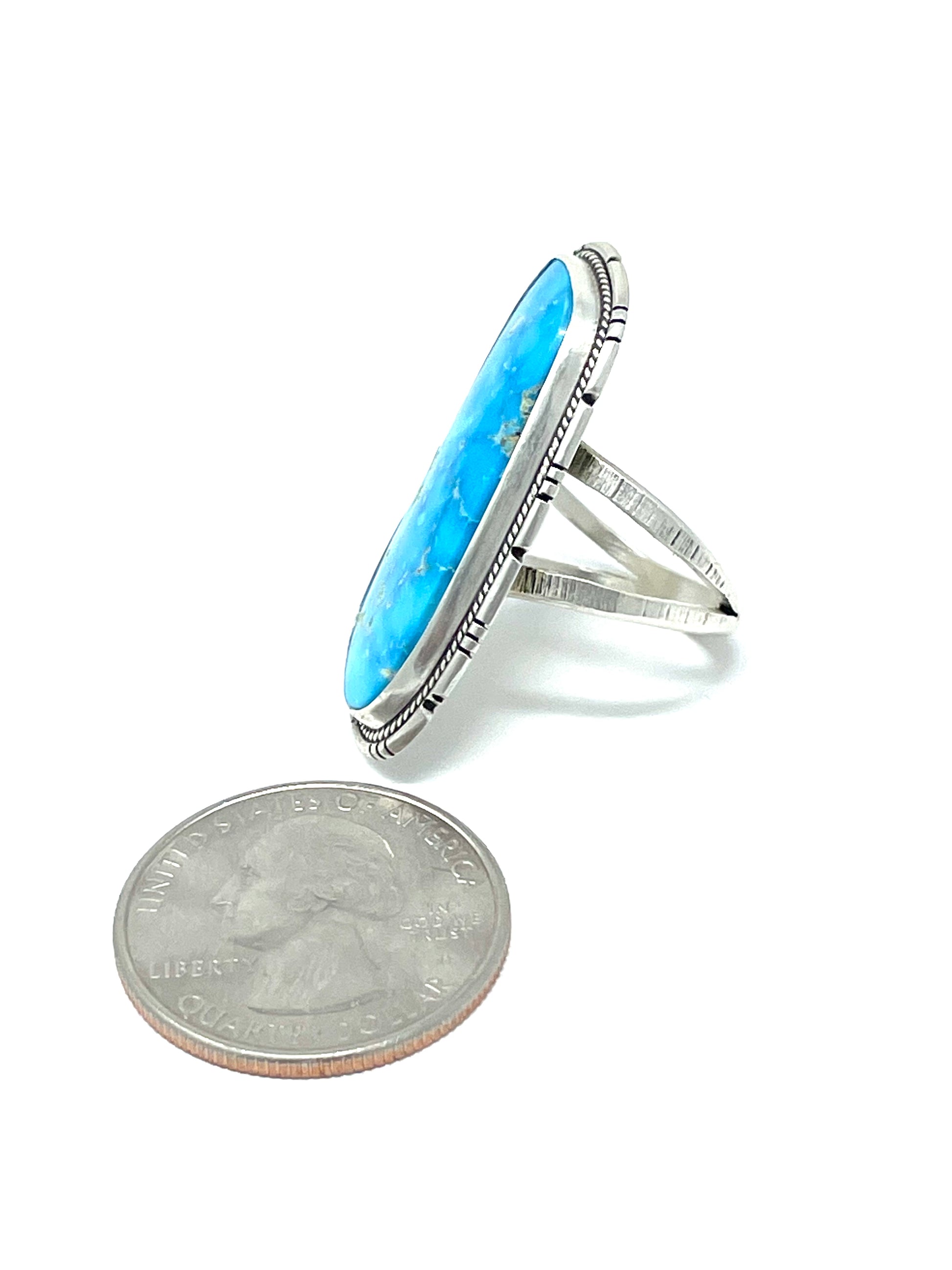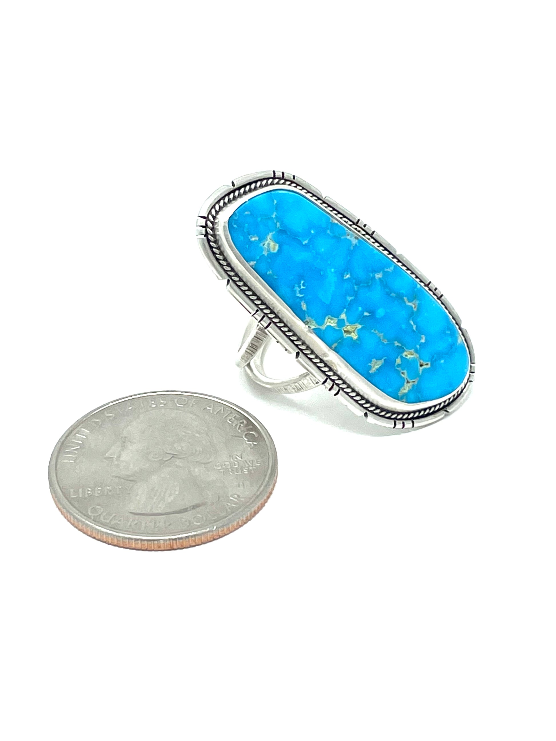 Free form Bluebird Turquoise ring set in sterling silver accented with small twist wire and hand etched half round. This is a beautiful statement piece. Size 7